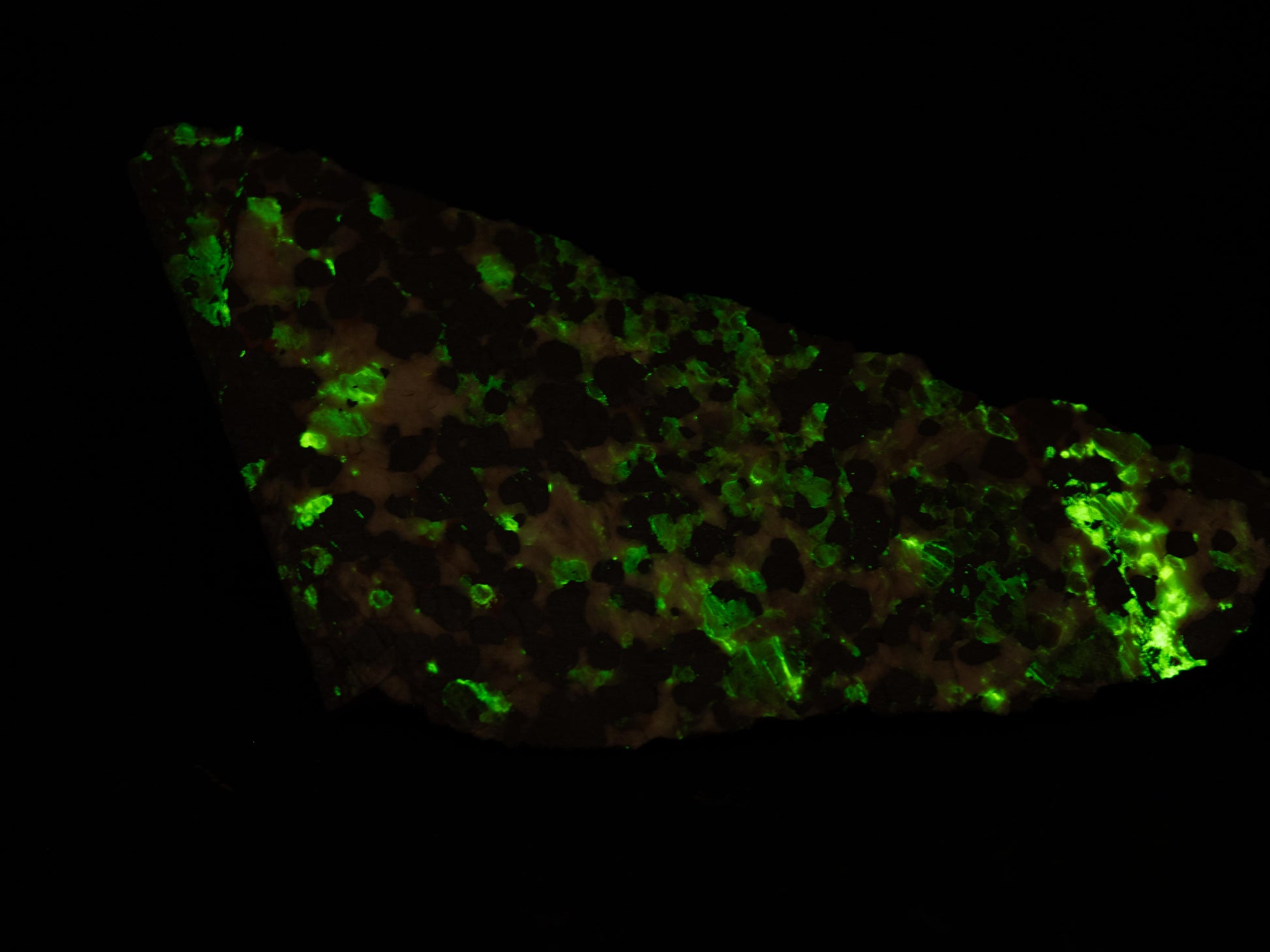 This cut and polished piece showcases the classic Sterling Hill combination of green-fluorescing willemite and red-fluorescing calcite, both minerals responding with exceptional intensity under shortwave UV. The cut and polished surfaces bring out the zonation and mineral distribution with a clarity that rough material simply can't match, making this as much a display piece as a scientific curiosity. Phosphorescence is strong and long-lasting — the glow lingers well after the lamp is removed, a property that never gets old regardless of how long you've been in the hobby.