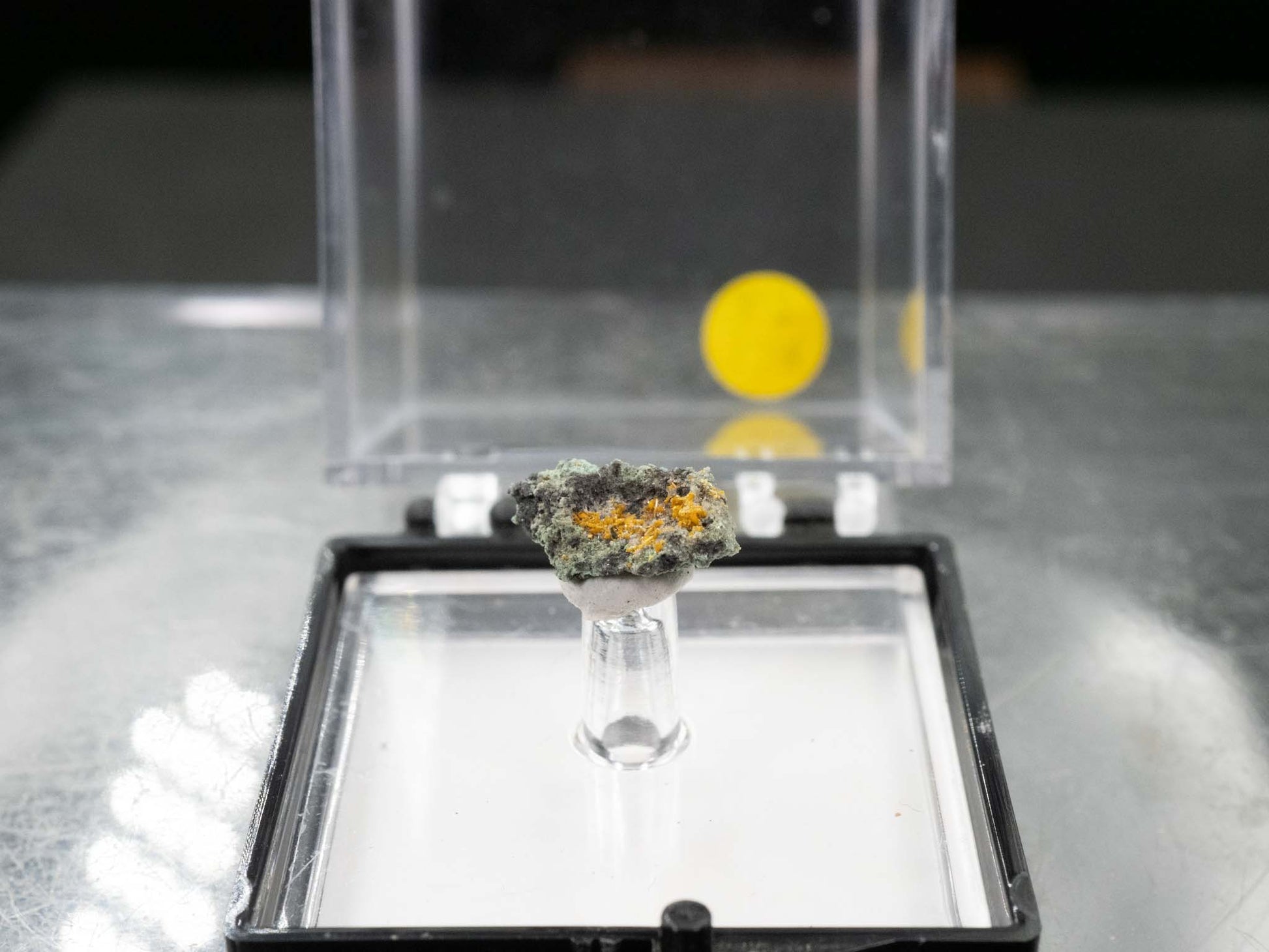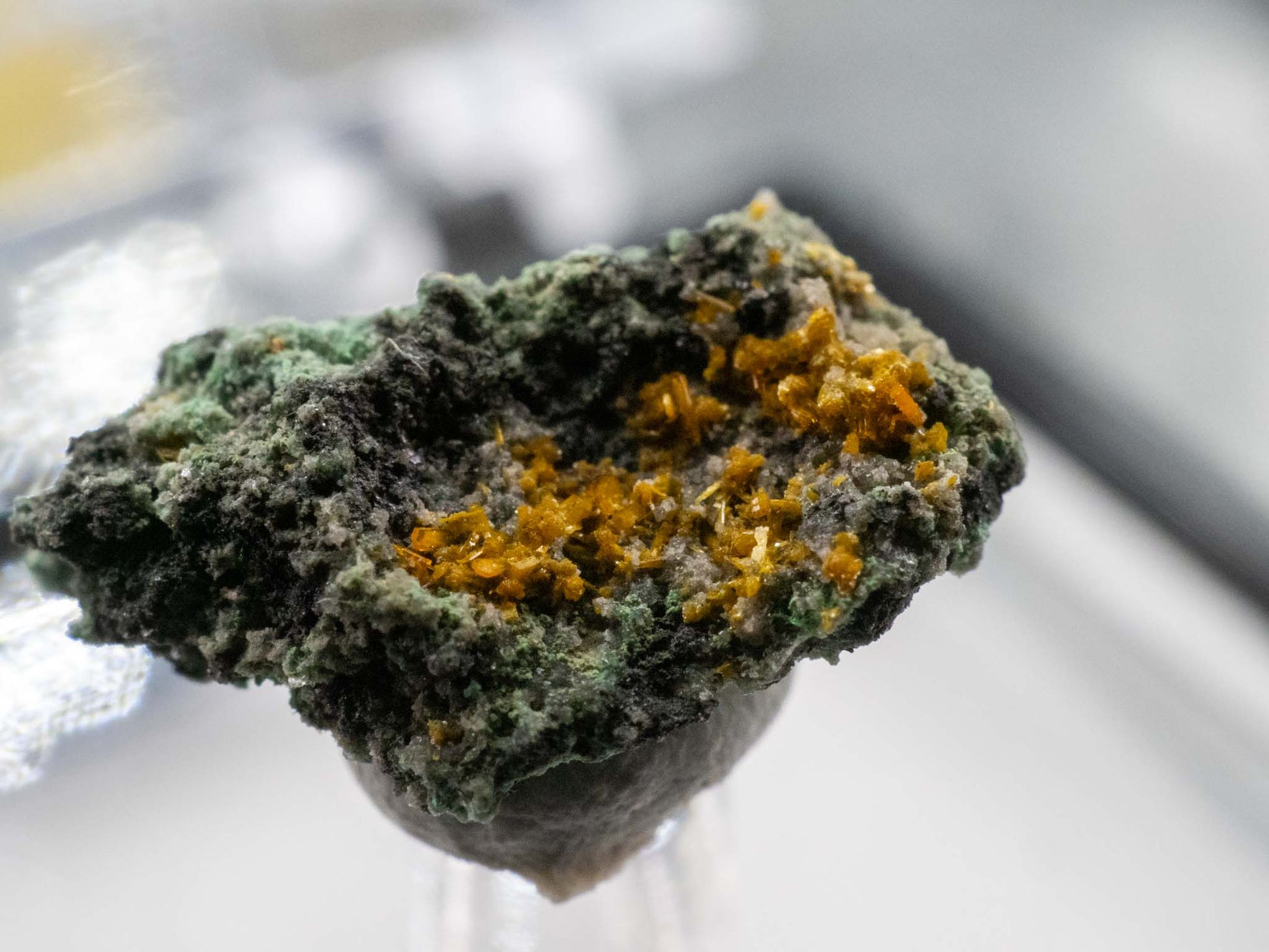 The Musonoi Mine in the Democratic Republic of the Congo is a world-famous locality for its rich deposits of uranium and copper minerals, including the striking secondary uranium minerals kasolite and metatorbernite. Kasolite, a lead uranium silicate, is typically found as bright orange, reddish-brown, or yellowish prismatic crystals or granular aggregates. This mineral forms through the alteration of primary uranium ores like uraninite in oxidizing conditions, often associated with copper-bearing rocks. Kasolite specimens from the Musonoi Mine are highly sought after by collectors for their vivid colors and well-defined crystal formations, which provide a glimpse into the geochemical processes that shaped this renowned deposit.