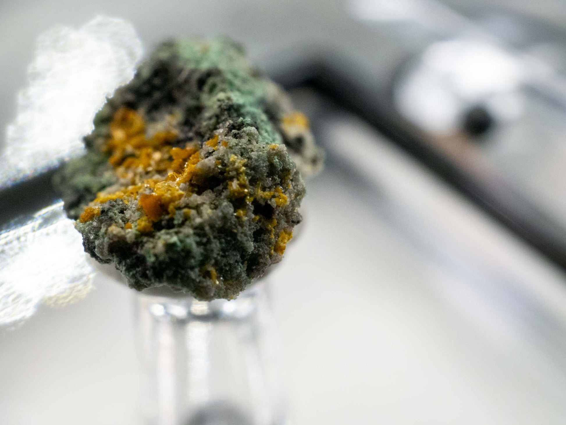 Metatorbernite, a vibrant green secondary uranium phosphate mineral, also occurs abundantly at Musonoi. It forms as tabular or micaceous crystals, often radiating in clusters or lining fractures within the host rock. Derived from the alteration of primary uranium minerals, metatorbernite develops under similar oxidizing conditions as kasolite and frequently coexists with it, creating visually striking mineralogical associations. The Musonoi Mine's metatorbernite is prized not only for its aesthetic appeal but also for its significance in understanding uranium-phosphate geochemistry in copper-rich environments. Together, kasolite and metatorbernite represent the dynamic mineralogical and geochemical history of the Musonoi Mine, cementing its reputation as one of the premier uranium-mineral localities in the world.