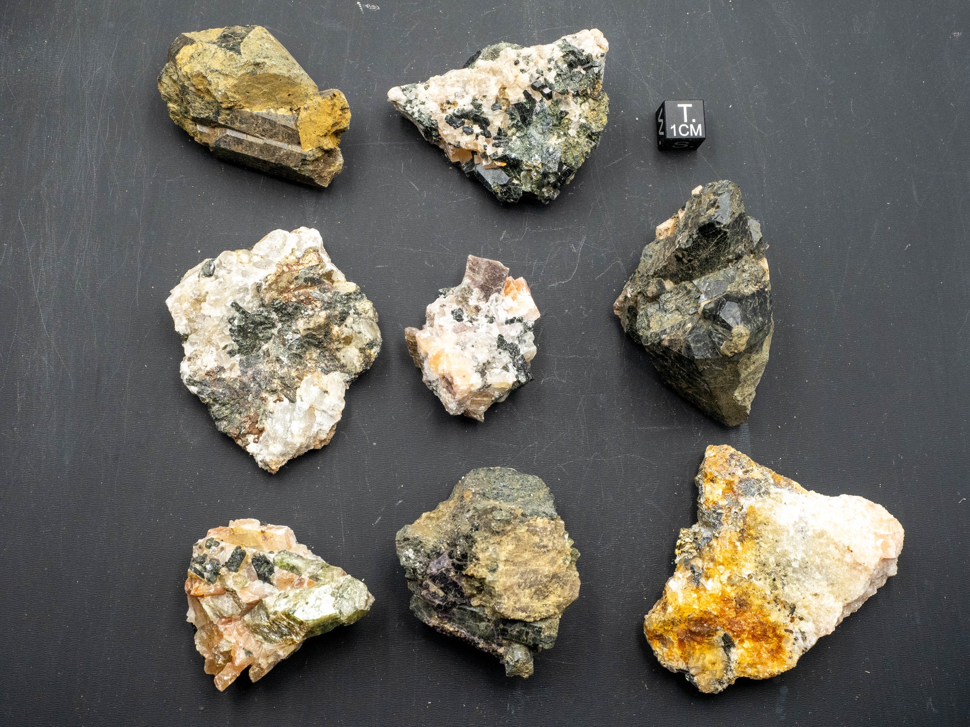 A collection of 8 specimens of various minerals including: Apatite, Fluorapatite, Chalcopyrite, Hornblende, Fluorite and a few others from the Yates Mine, Otter Lake, Pontiac RCM, Outaouais, Quebec, Canada.