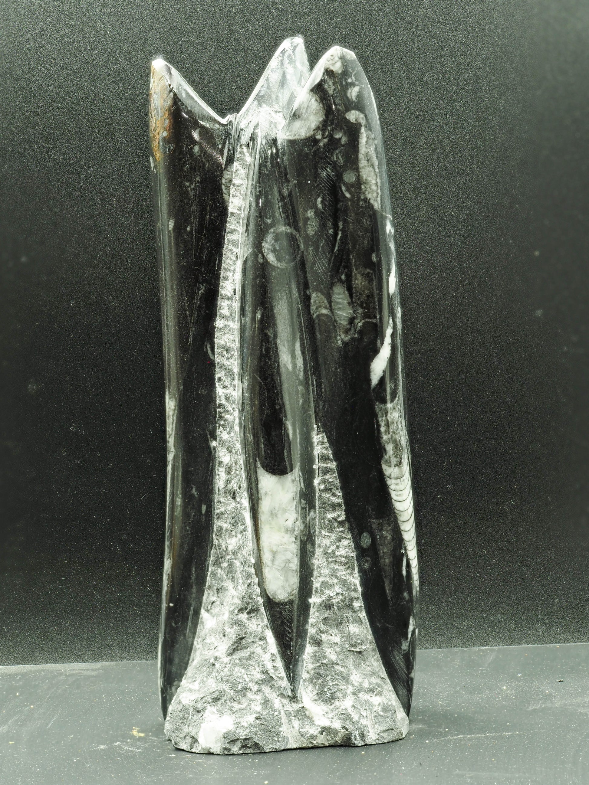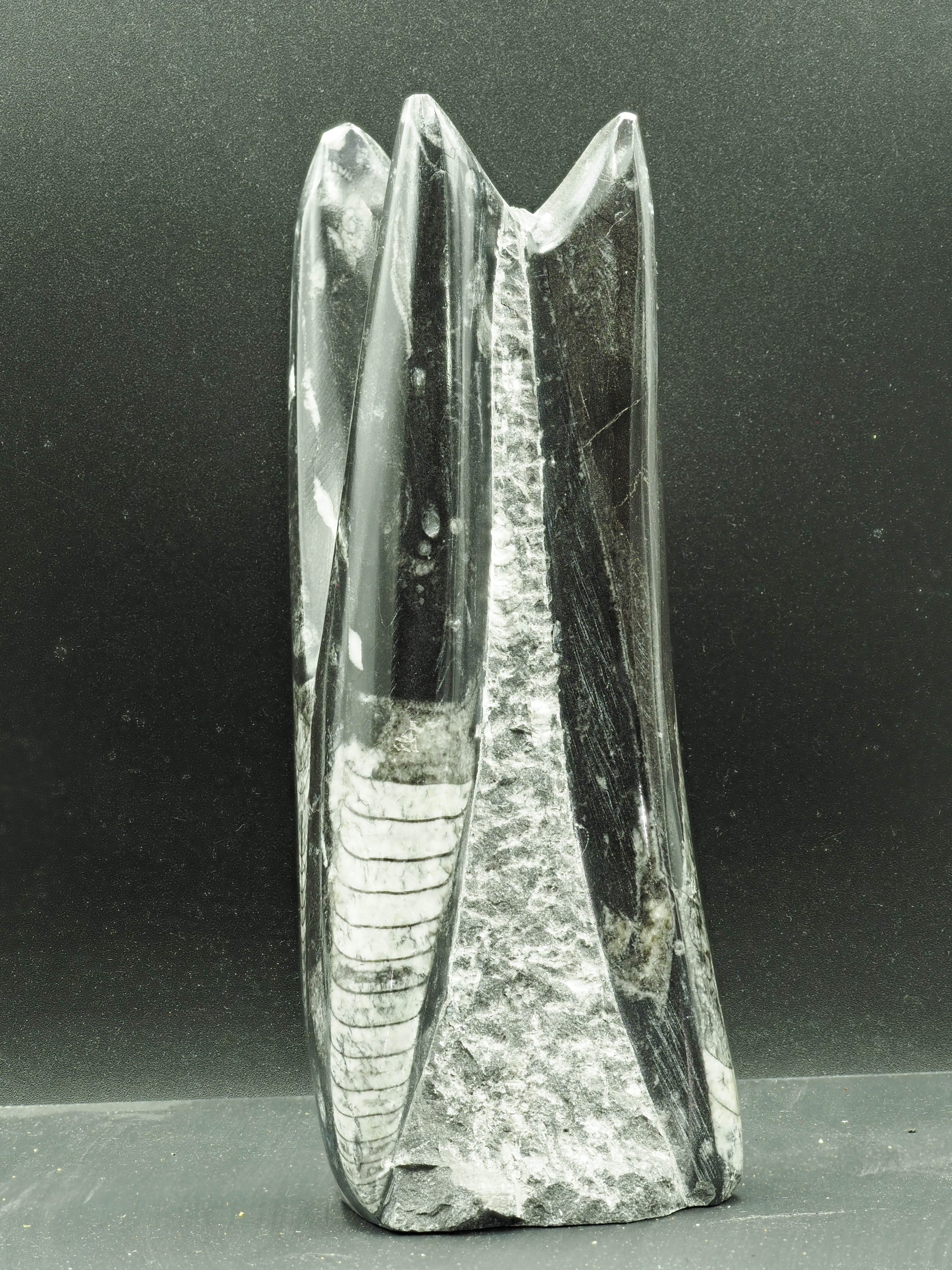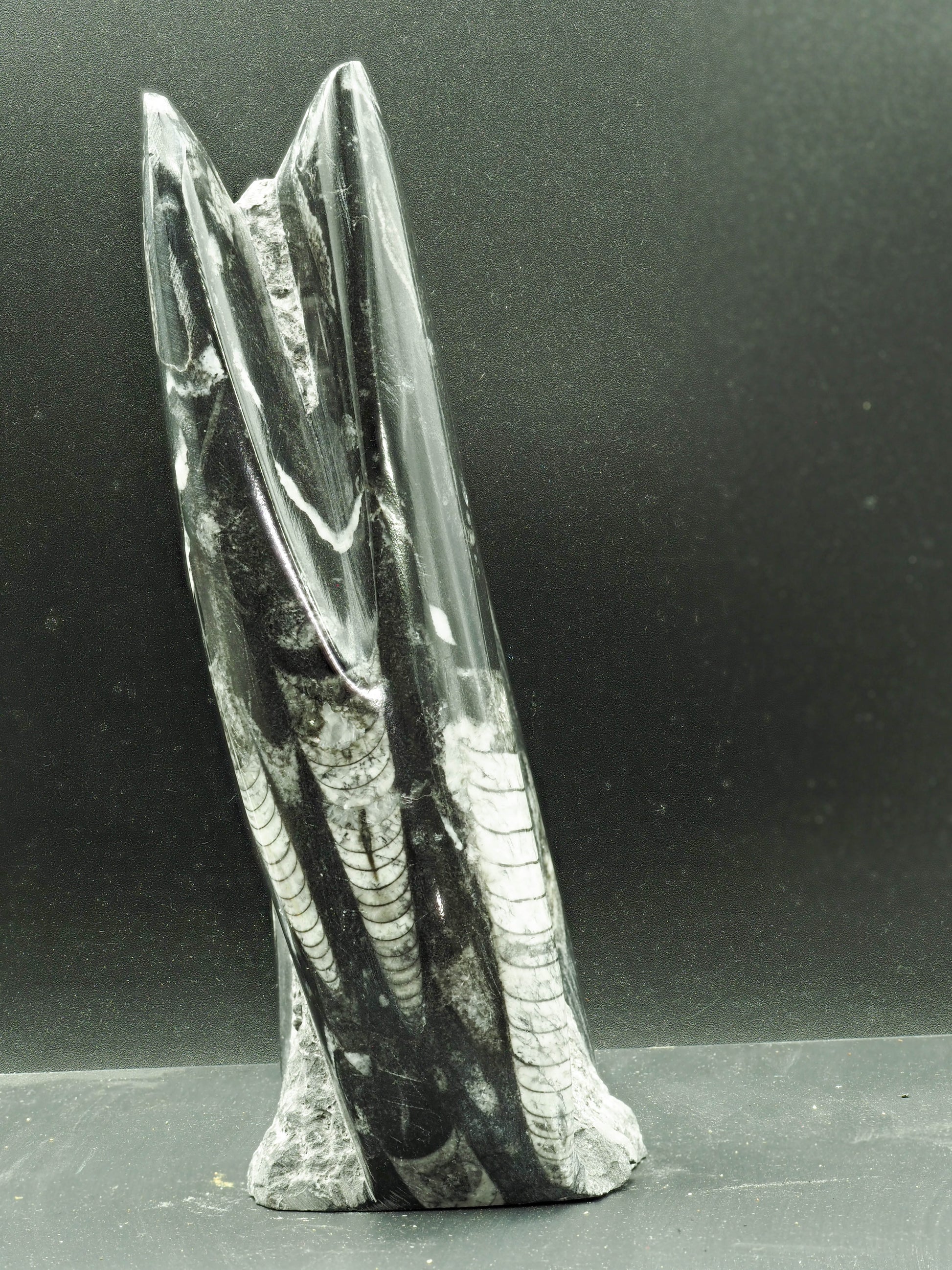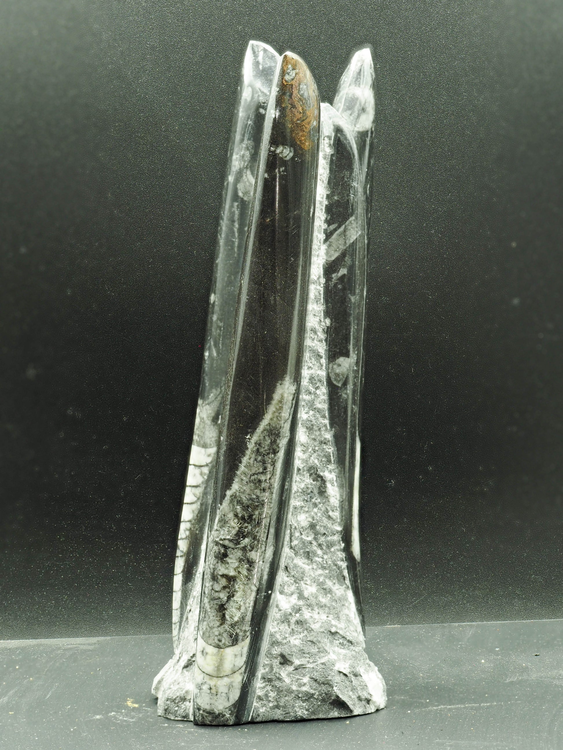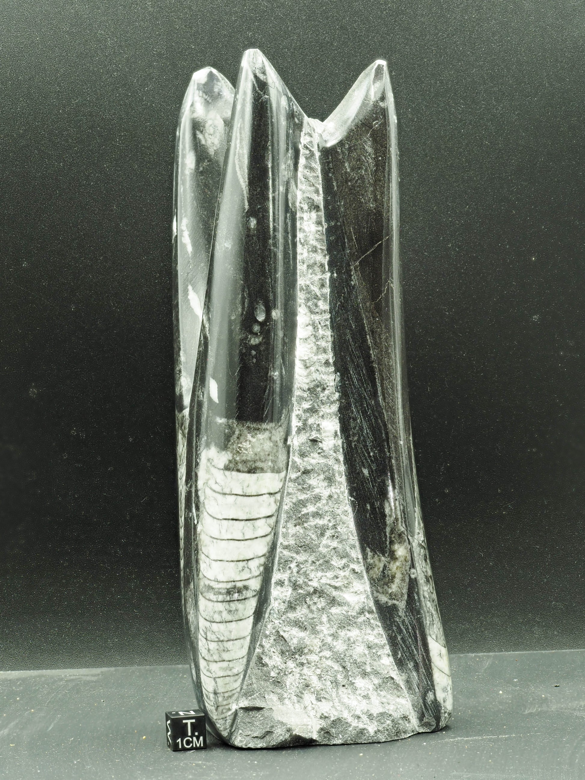 This polished fossil of Orthoceras, an extinct genus of straight-shelled squid-like cephalopods, comes from the Devonian limestone deposits of the Atlas Mountains in Morocco. Preserved in black matrix stone, the sleek fossilized shell exhibits intricate chamber lines and central siphuncle structures typical of Orthoceras, which once thrived in Earth's ancient oceans over 400 million years ago. The contrast between the fossil and its surrounding stone has been enhanced through careful lapidary work, resulting in a highly decorative piece ideal for display.