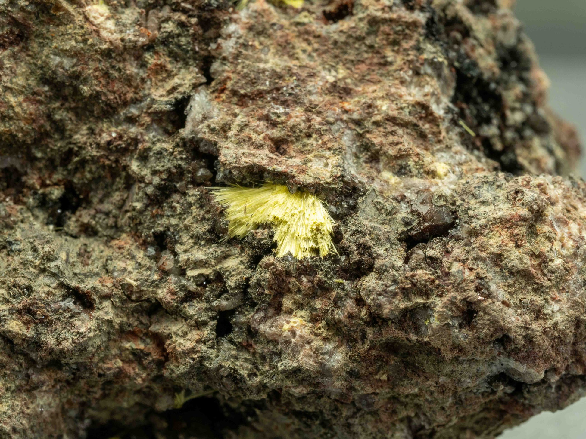This classic Canadian uranyl silicate comes from the historic Faraday Mine, one of the best-known uranium producers in the Bancroft camp. Uranophane typically forms as fibrous to acicular sprays in vibrant lemon-yellow to honey tones, often lining fractures or coating altered host rock. Its silky to satiny luster and radiating crystal habit give specimens strong visual texture and contrast against darker matrix.